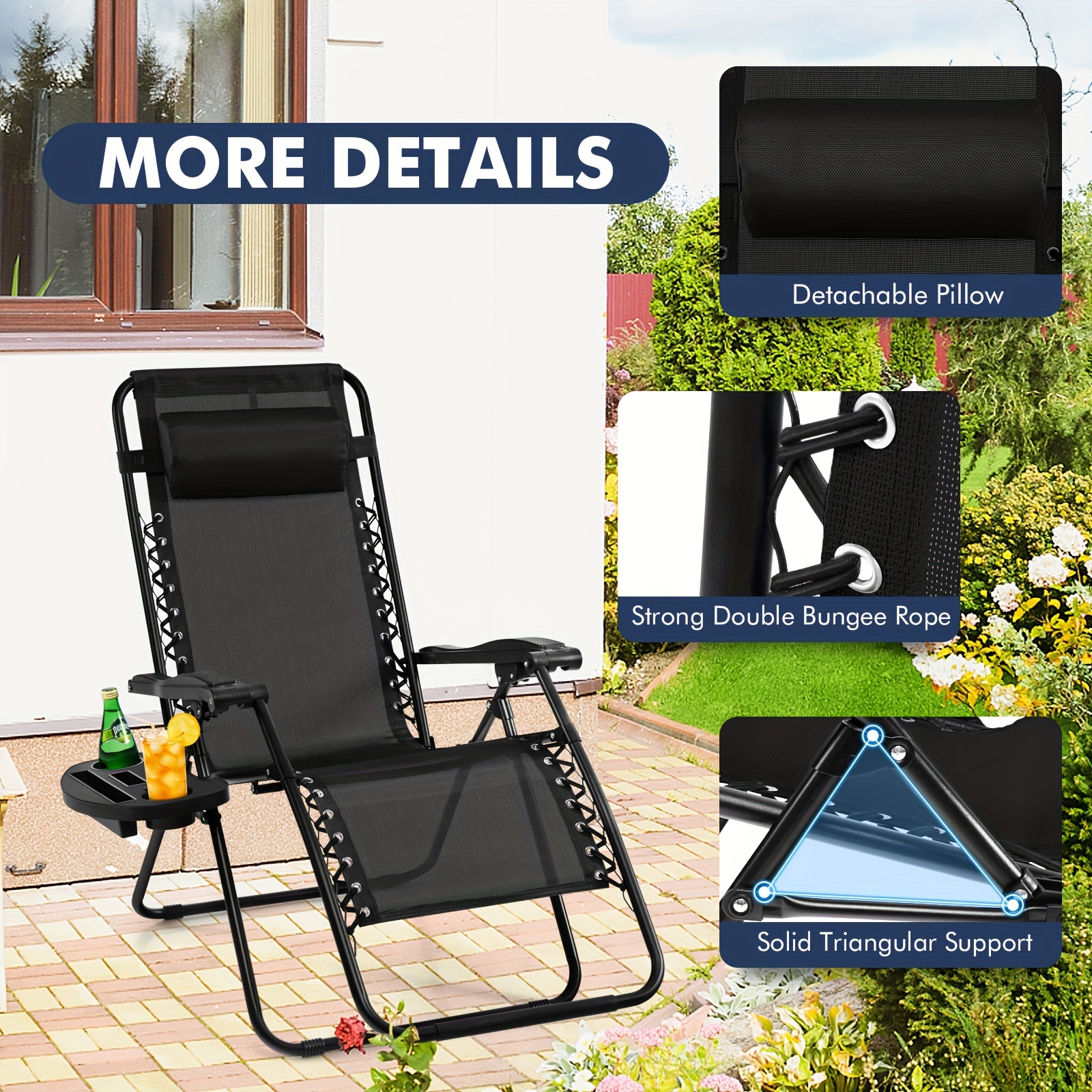 These High Quality Zero Gravity Chairs Are Great For Beach, Courtyard, Poolside Or Indoor Places. With A Folding Design, You Only Need To Leave A Space For It In Your Trunk And Our Recliners Can Accompany You Anywhere And Anytime. The Ergonomic Headrest And High-elastic Bungee Ropes Provide Comfortable Support.