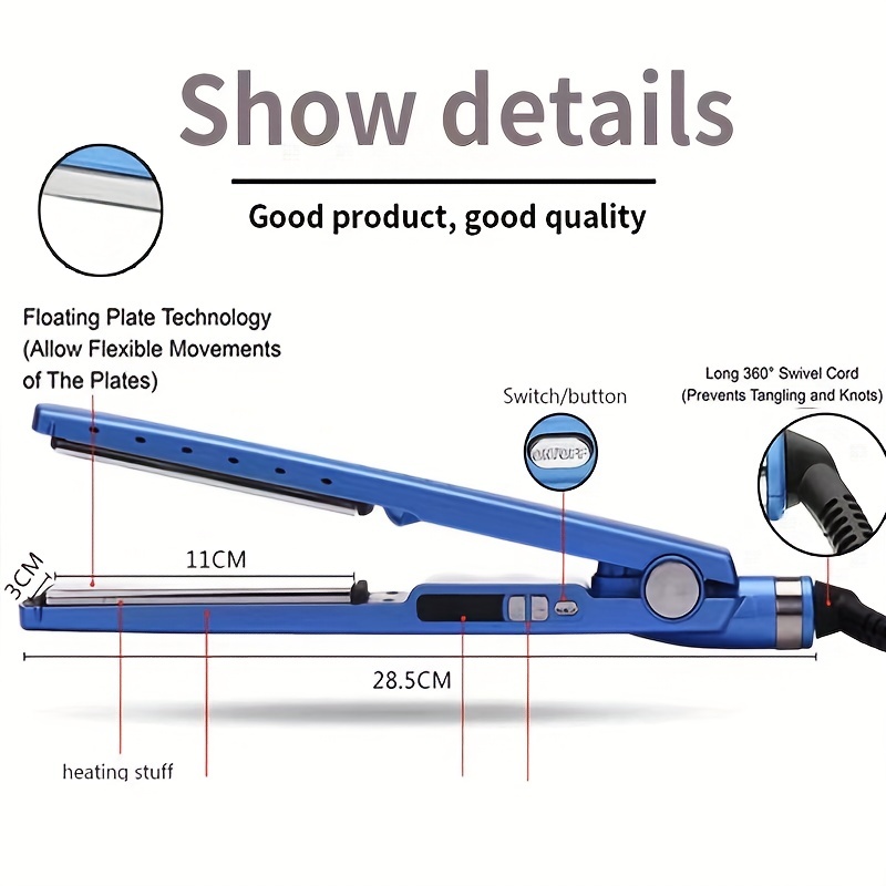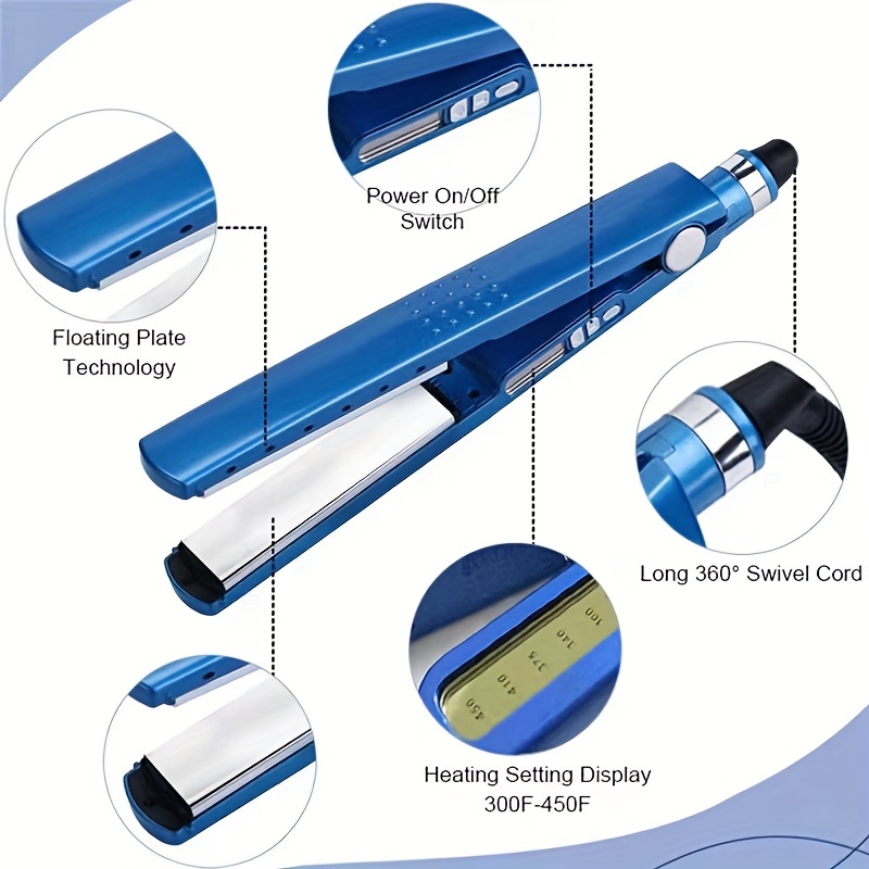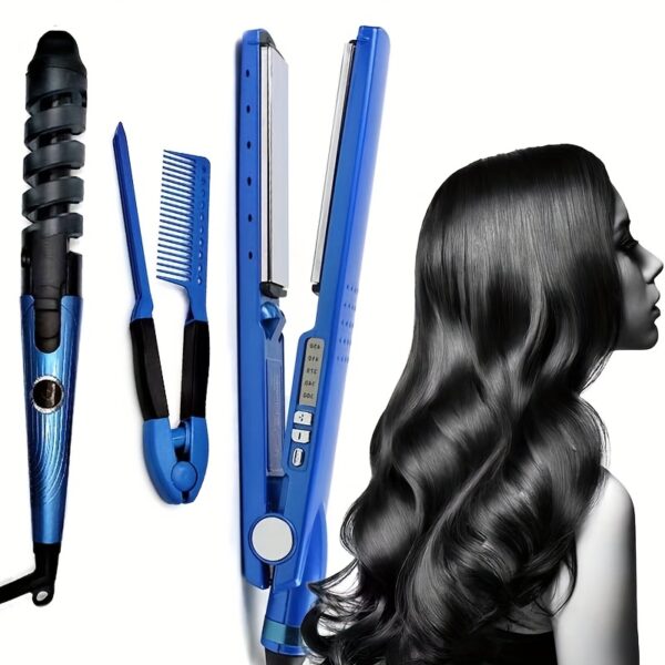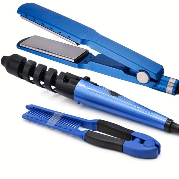 3pcs Blue Hairdressing Tools Set, Hair Straightener Flat Iron, Curling Iron, V Shaped Hair Comb, Multifunctional Hair Styling Tools For Barber Salon Home Use