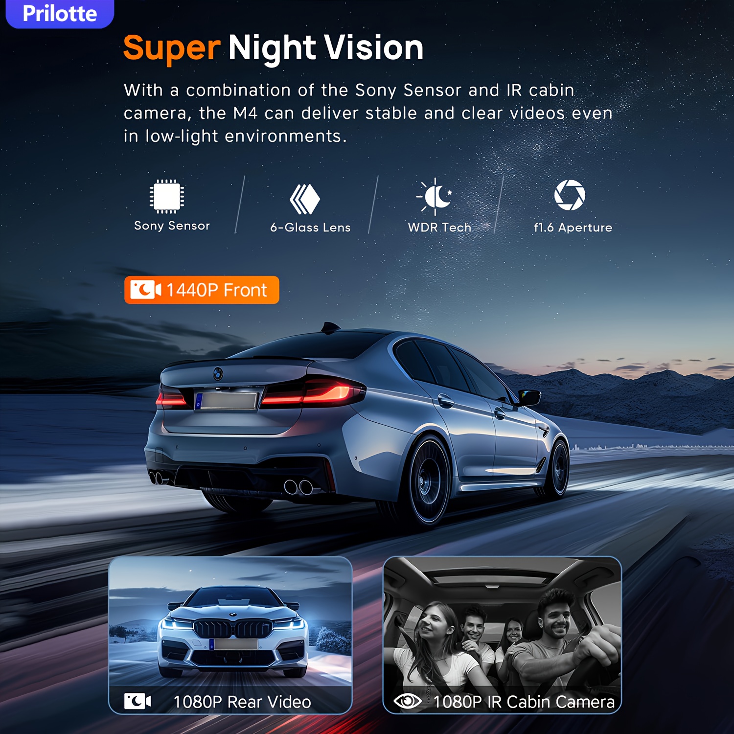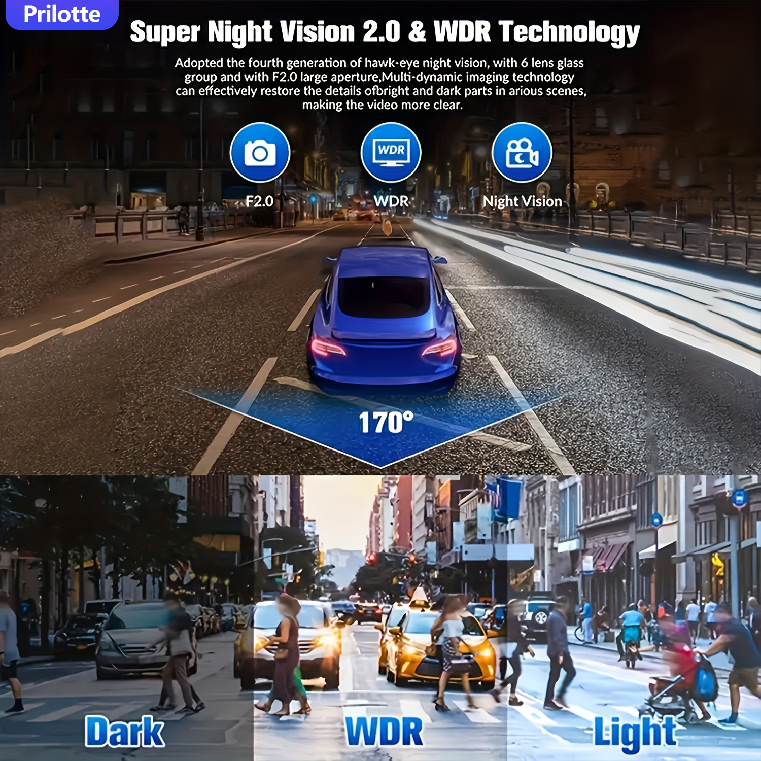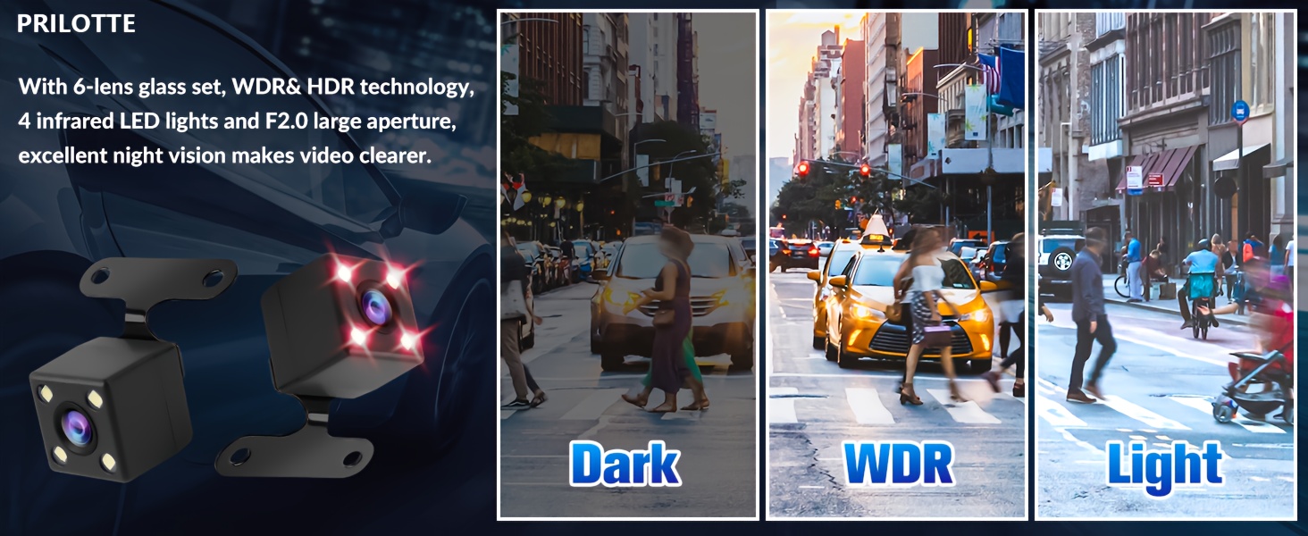 【Dash Cam Front and Rear】The dashcam with super night vision and infrared cabin light uses f/2.0 wide aperture with a total of 6 layers of optical lens and WDR technology, coupled with 4 infrared lights, enabling the car camera to show good color accuracy and clearly capture important details day or night.
