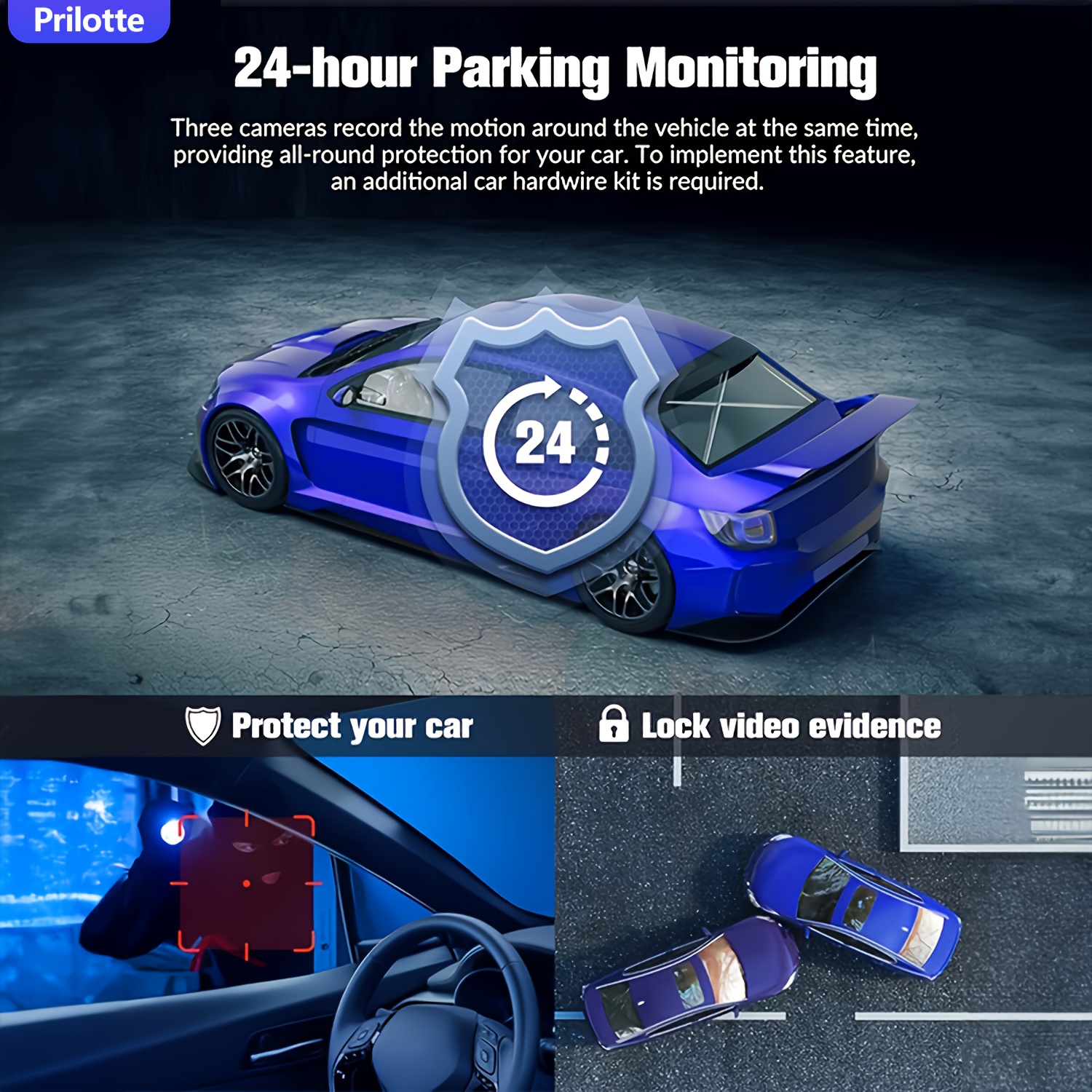 【Dash Camera】To achieve 24-hour parking continuous recording function, you need to buy a hardware kit to start (note: this product does not include a hardware kit, you need to buy it separately) When your car turns off, the dashcam will automatically switch to the parking mode. Collision detection can be triggered by impact or collision, and delayed recording maintains low power consumption and low frame rate continuous recording,protecting vehicle from theft or vandalism.