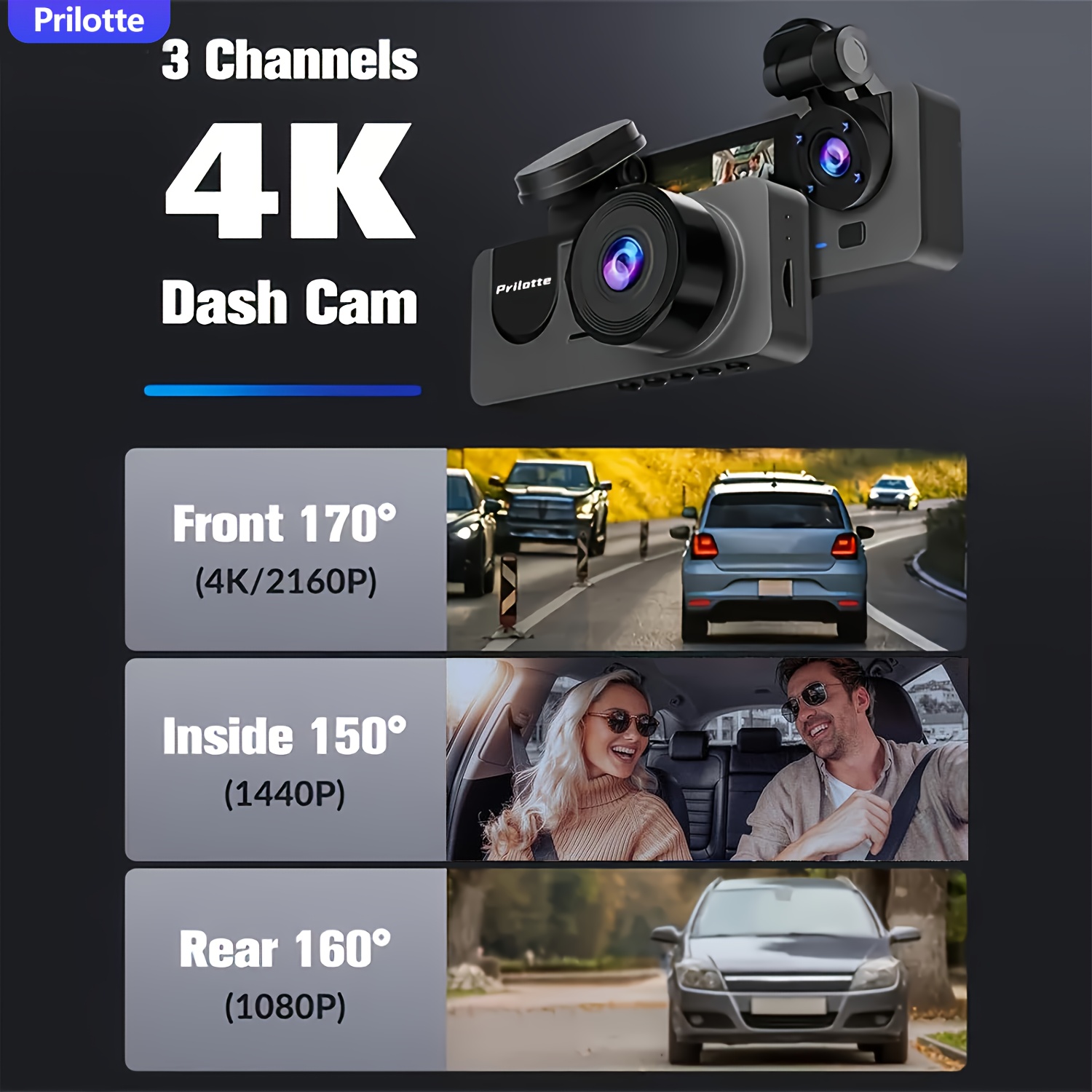 【Dash Camera for Cars】3 channel camera can record video up to Full UHD 4K( 3840*2160P) on the front and 1080P on the rear, Offering a 170° front camera, a 120° built-in camera and a 150° rear camera, it can simultaneously monitor the front, rear and interior of the vehicle to maximize road coverage, greatly enhance night vision and provide clear and crisp images and videos. The dashcam is a combination of front, rear and interior cameras..