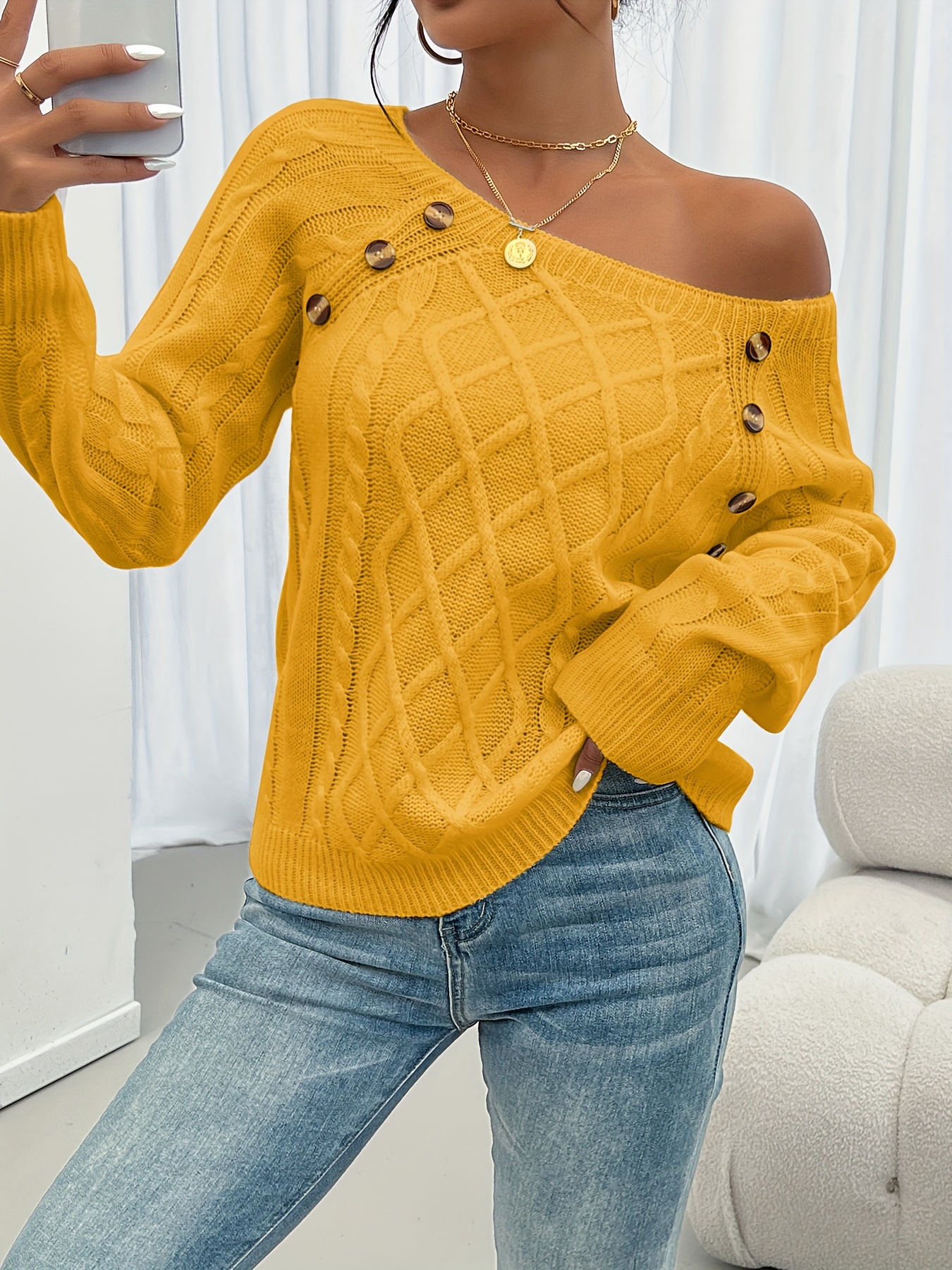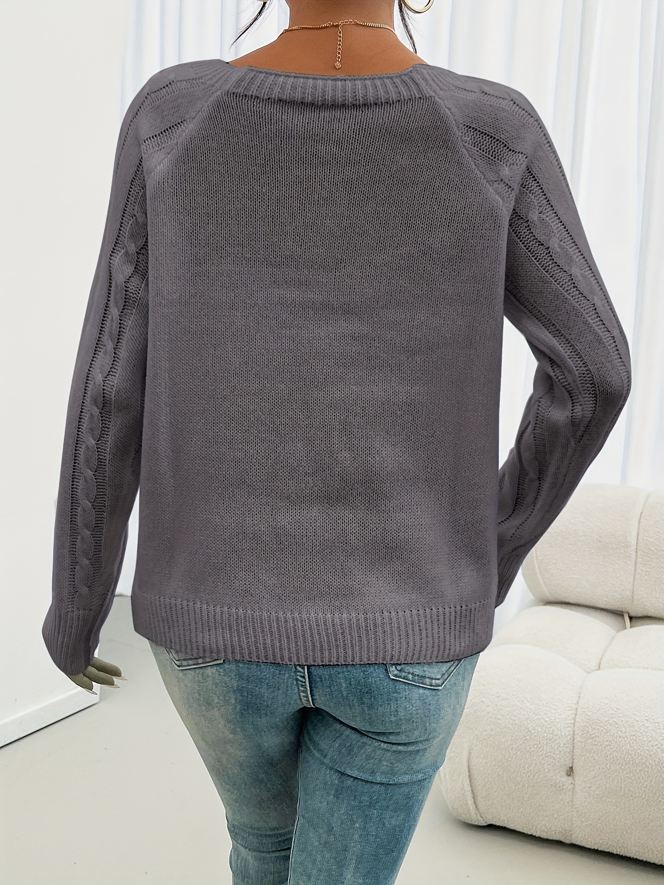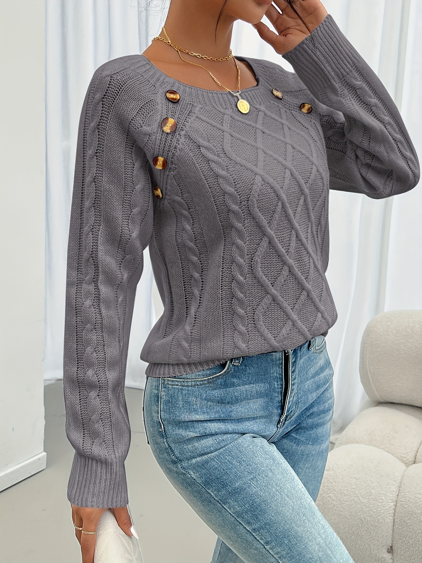 Cozy Long Sleeve Raglan Cable Knit Sweater – Soft Mid-Elastic Acrylic Fabric, Square Neck, Button Details, Regular Length, Solid Color, Perfect for Fall/Winter – Casual Womens Knitwear for Everyday Wear