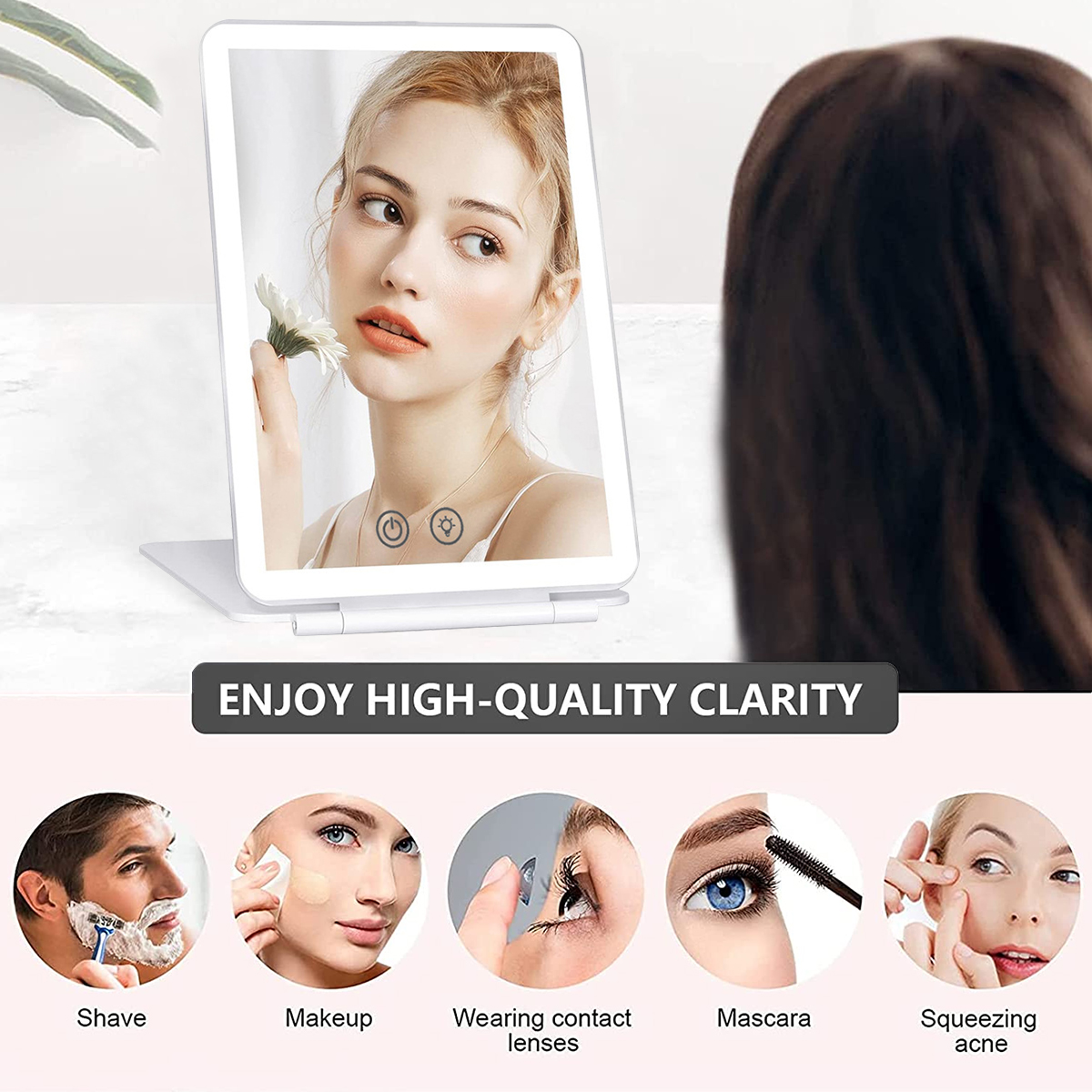 [Rechargeable and Intelligent Dimming] USB cable for charging, it can work for about 2 hours after fully charged. The brightness of the makeup mirror is controlled by the touch button, long press the button to adjust the brightness, the brightness memory function is also convenient for your next use.