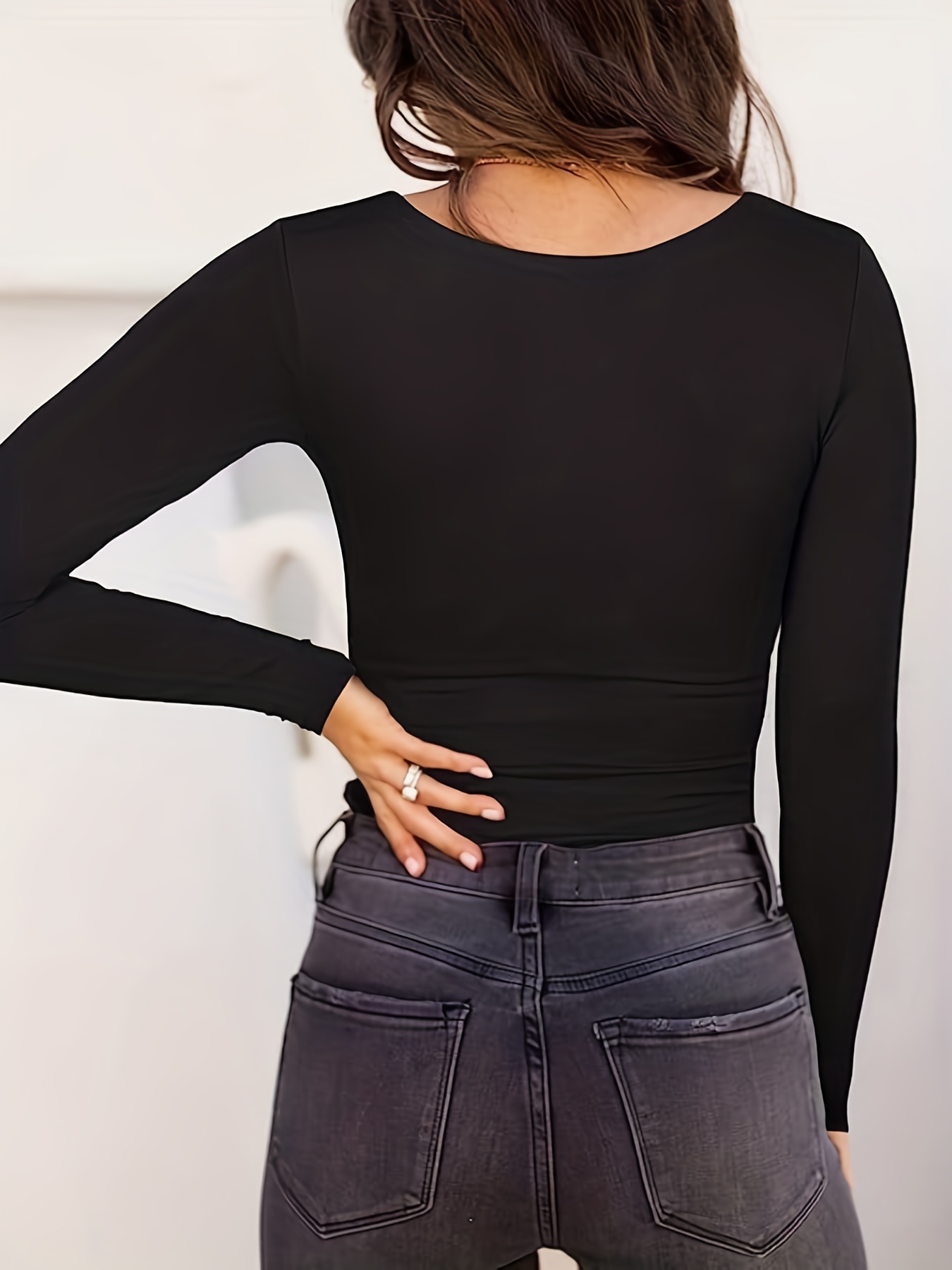 Solid Square Neck Bodysuit, Casual Long Sleeve Slim Bodysuit, Women’s Clothing