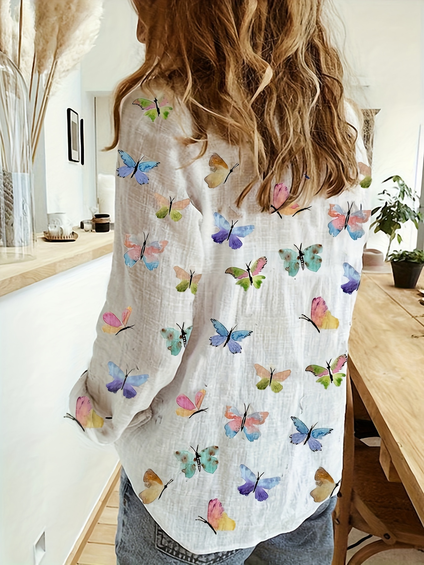 Stylish Butterfly Print Long Sleeve Shirt – Women’s Casual Clothing for Spring & Fall – Comfortable, Relaxed Fit, Button Front, Versatile & Chic