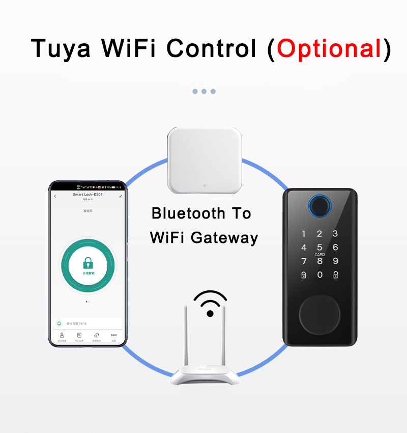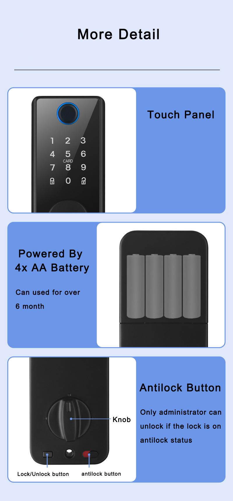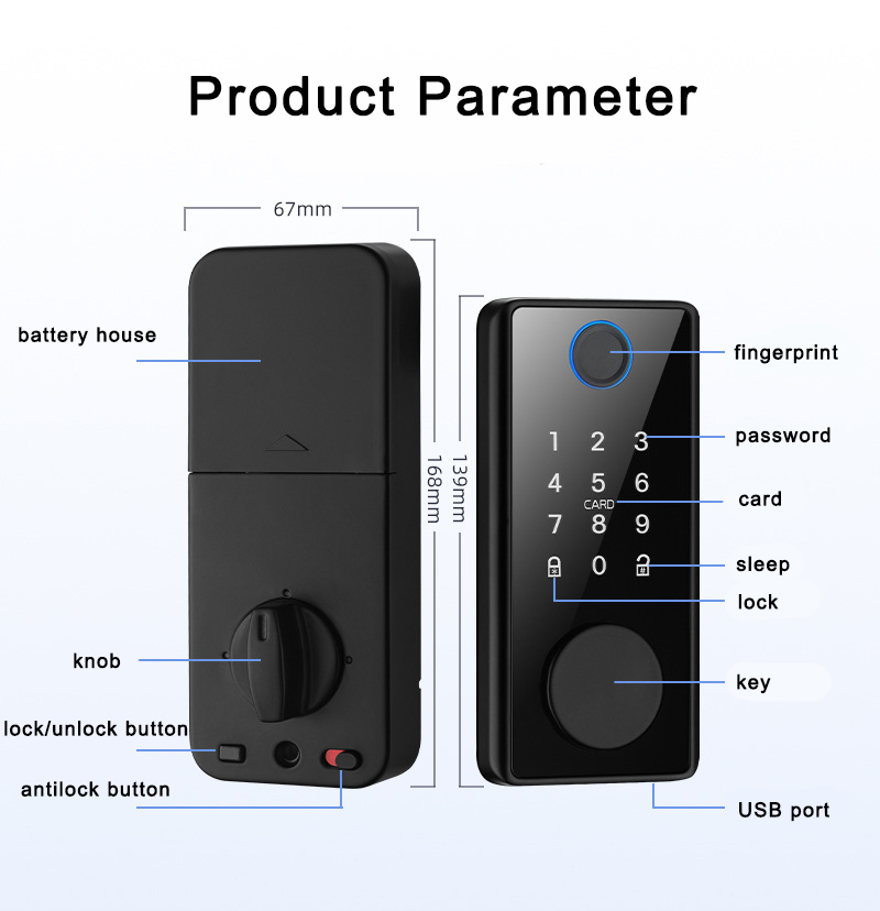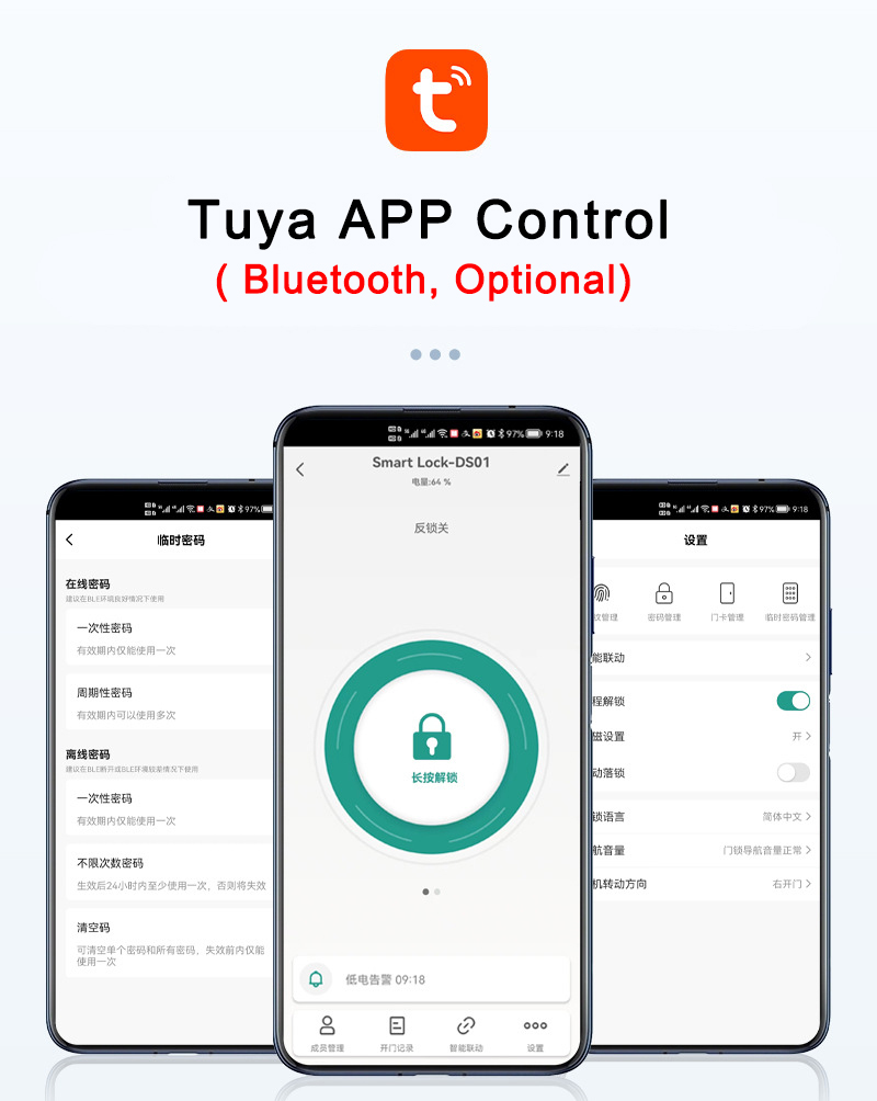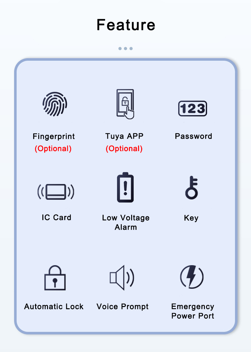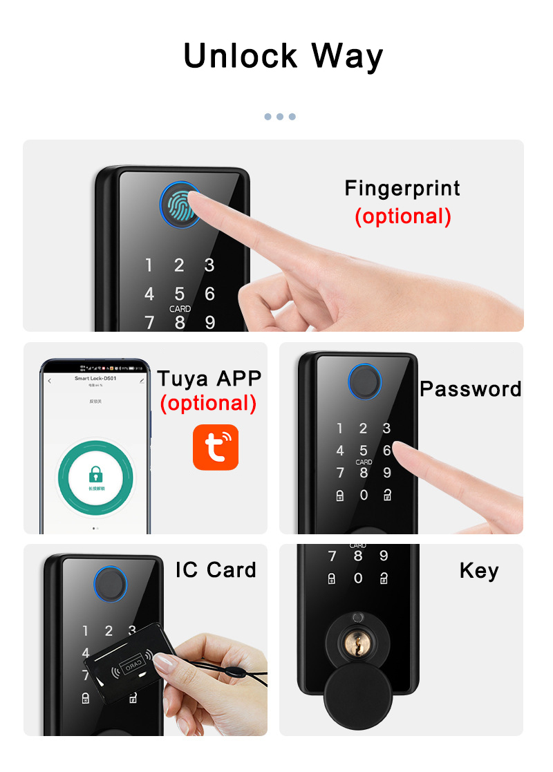 Unlock mode: Fingerprint (optional) / Password / IC card / Tuya APP / Mechanical Key