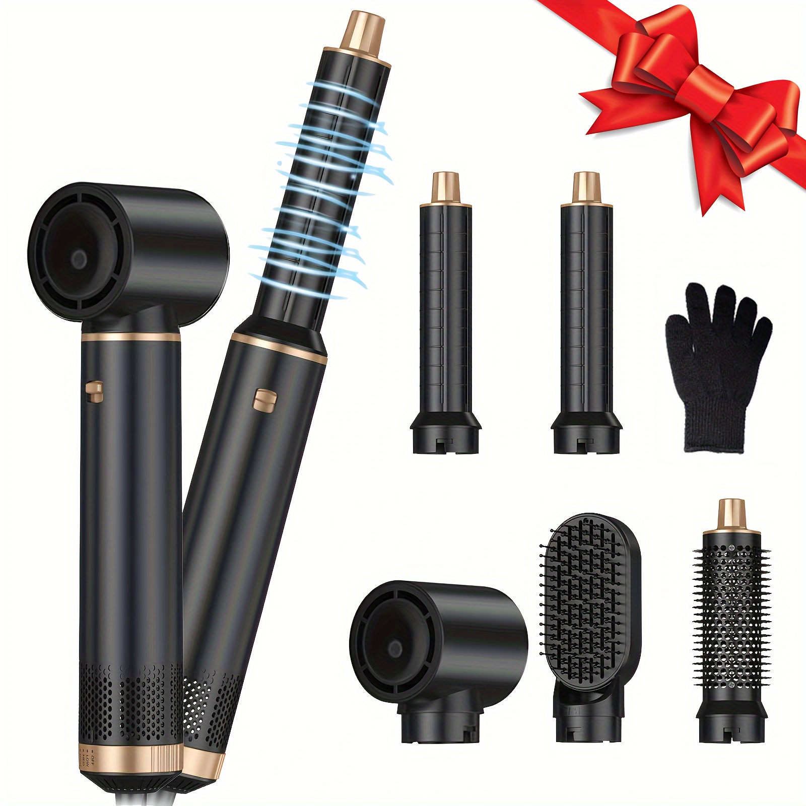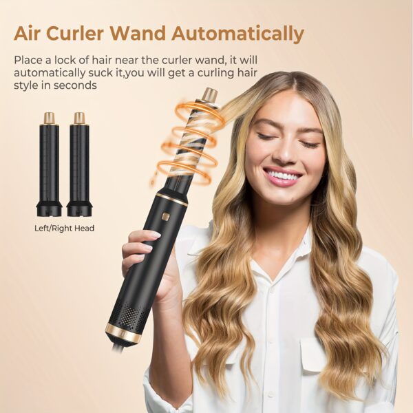 5 IN 1 BLOW DRYER BRUSH: Multifunctional hair dryer brush unleash your creativity and allow you easily become your own stylist and create various styles you want. Brush blow dryer achieve any curl effect you desire with its powerful air-wrapping technology. Wand curling iron set includes 1 * hair dryer, 2 * hair straightening brush, 2 * left right Warm air curler and 1* heat-resistant glove