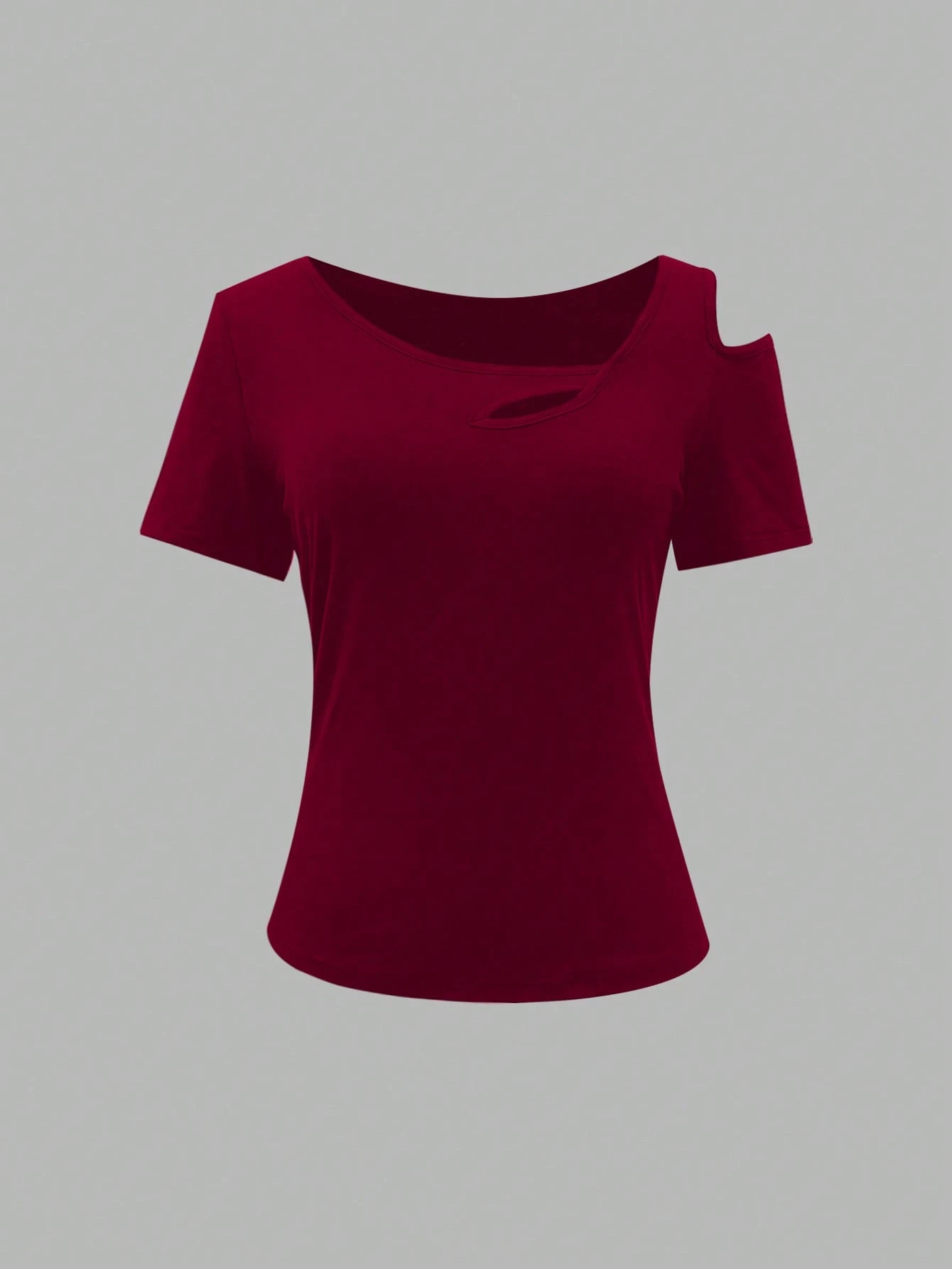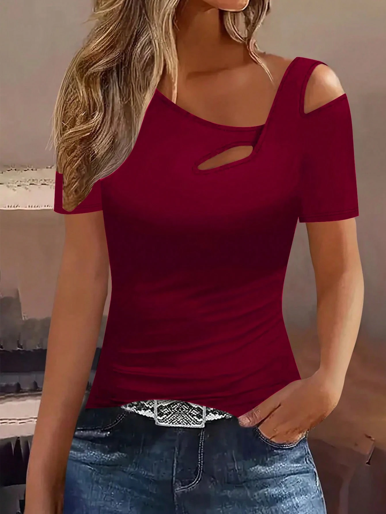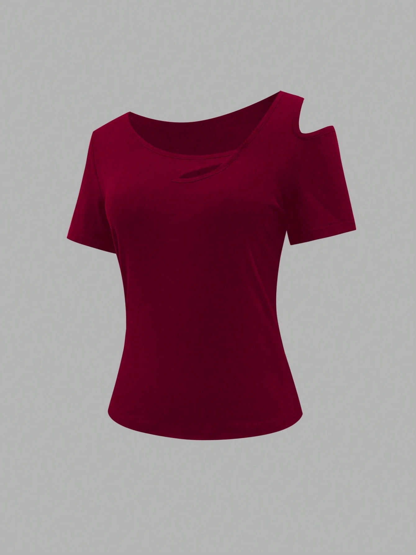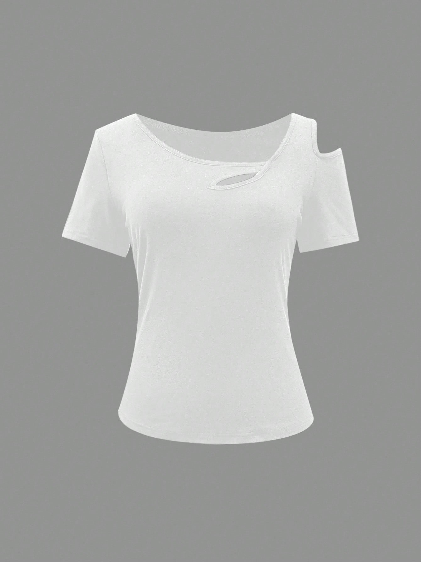 Women’s Casual Solid Color Asymmetric Neck Hollow Out T-Shirt, Summer